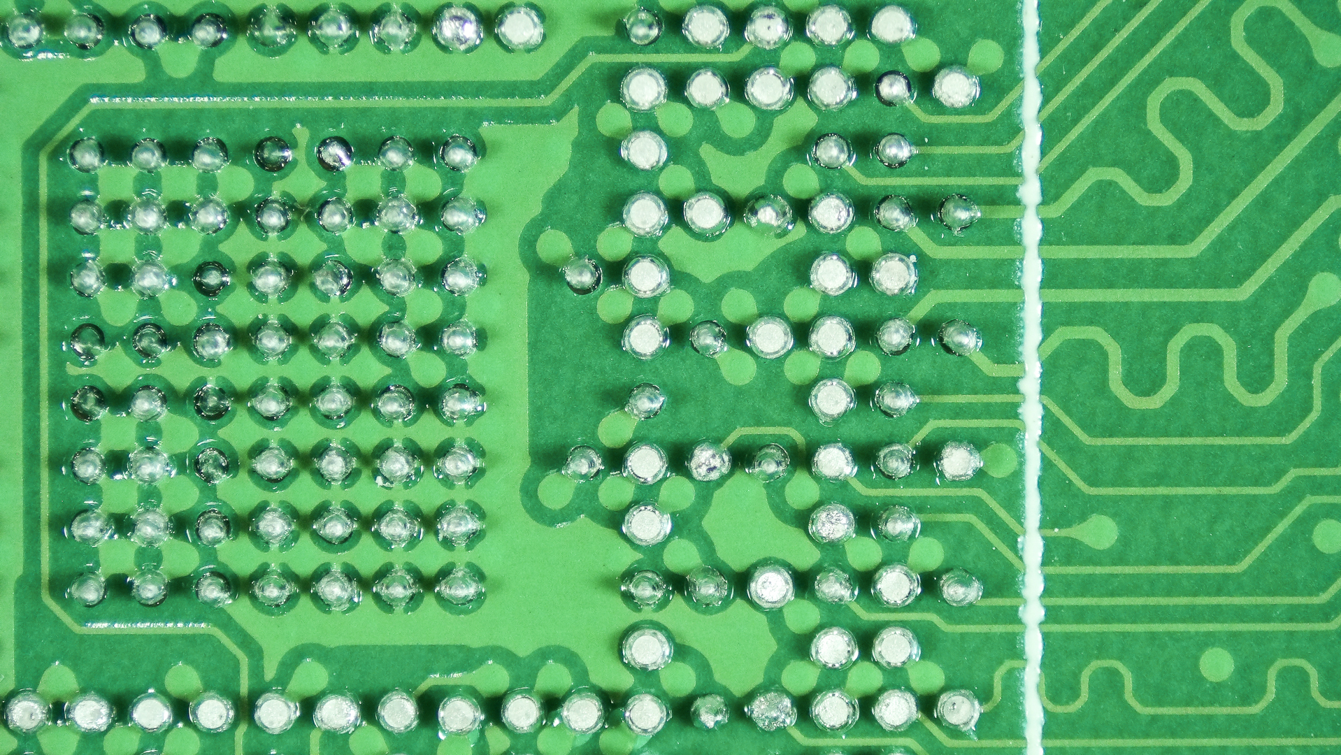 The die itself is pretty fascinating. Below, you can see part of it at full magnification on our inspection scope. The green is the top layer of PCB material stuck to it, but in the middle you can see the silicon of the die, and the grid-like structure of the features on the die. Each of those tiny vertical strips is just 10 microns wide (100th of a millimetre), and the small black square at the bottom (which may be a manufacturer's label?) is 0.1mm wide.