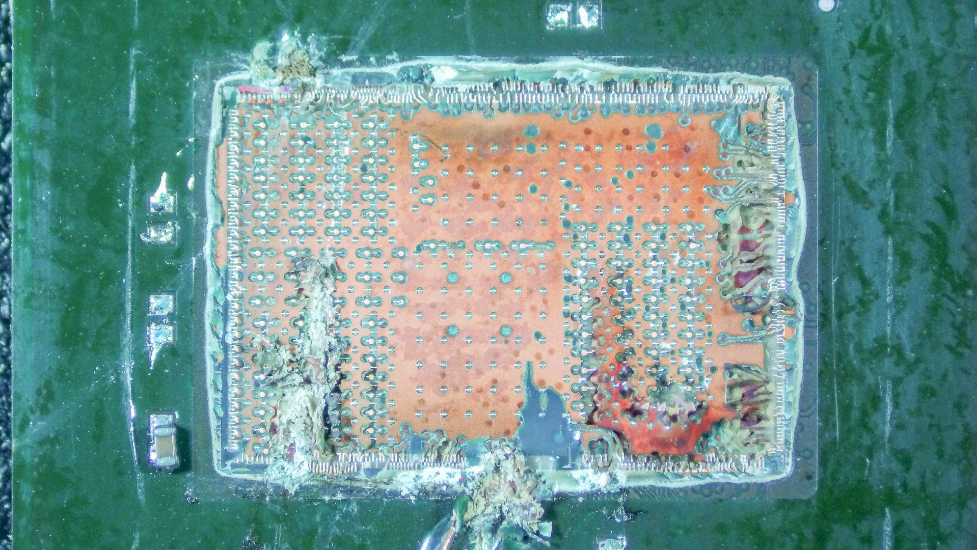 Removing the die from the carrier PCB was really tough, as it was bonded as well as soldered, but a lot of heat and gentle prying got it loose eventually. The image below shows the carrier PCB after the die had been removed. You'll see that the top layer of the PCB actually came loose with the die, exposing the copper layer below. You'll also see all of the pins that connect the die to the PCB.