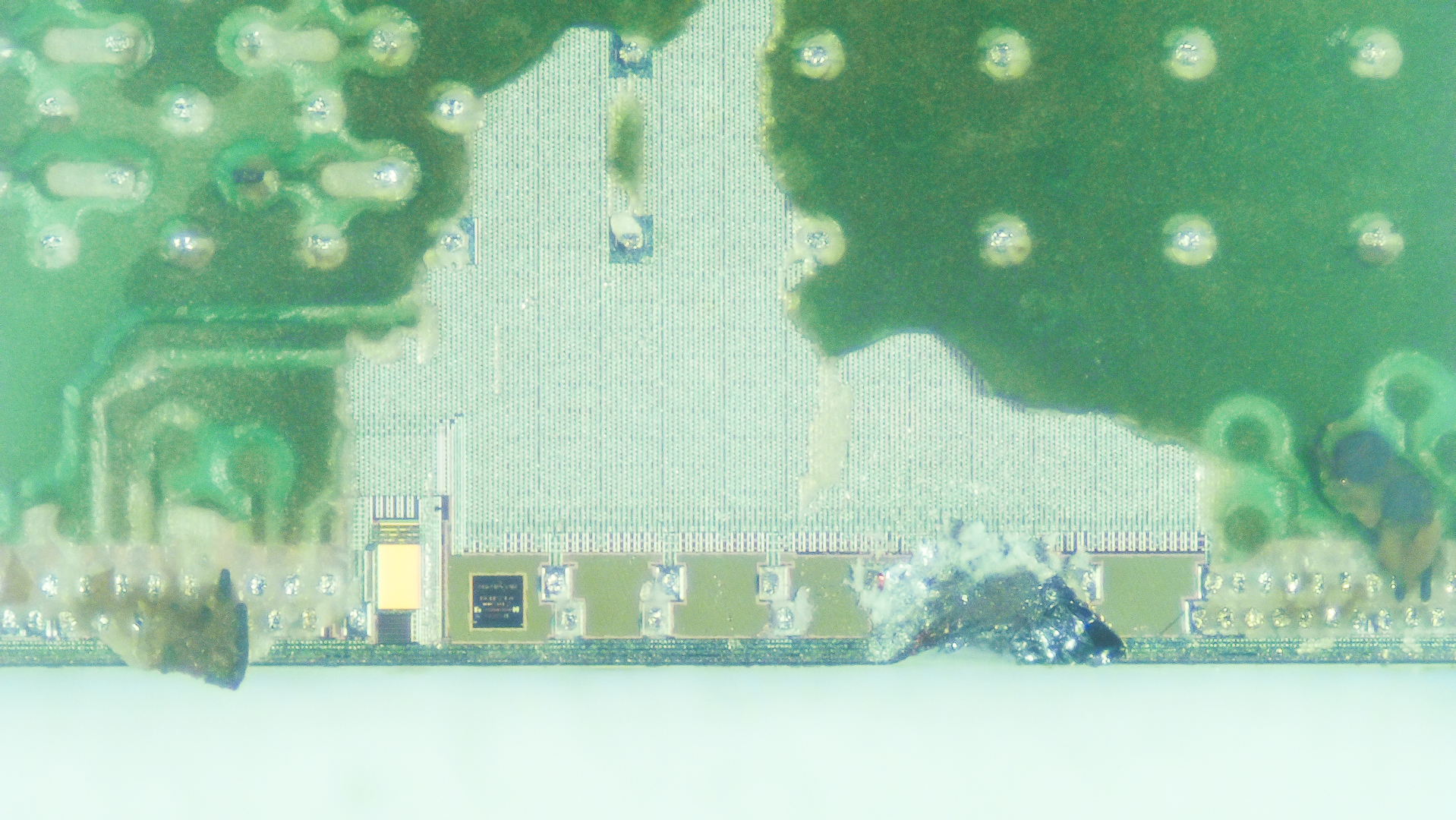 We pried off the metal shielding from the top of the SoC, that was held on using a ring of adhesive round the outside with some thermal paste between the top of the die and the metal. This revealed the carrier PCB and die. We then desoldered the carrier PCB, revealing the BGA solder pads underneath.