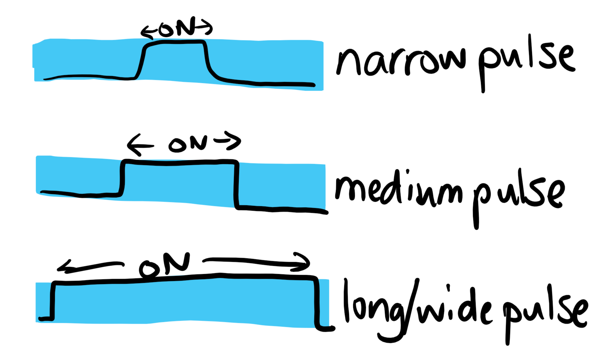 Your eyes can't see these changes (electricity, speed of light etc) so a narrow pulse (like at the top) will make a light bulb appear dim, compared to a wide pulse where it's being given a bigger dose of electricity.
