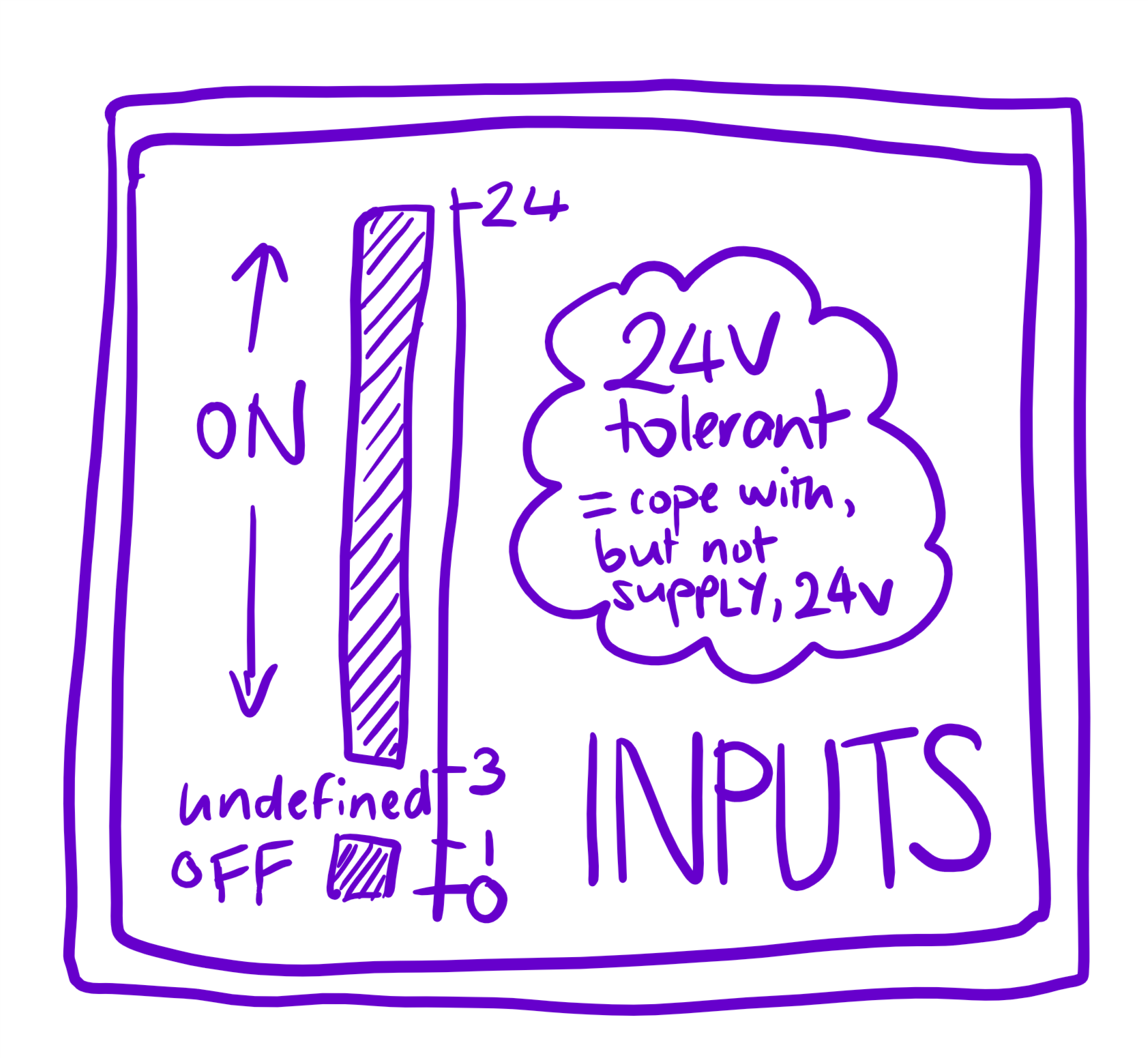 | input | clear on or off | no detail, sometimes voltage isn't high enough to trigger it | alarm, full, pressure pad, motion sensor |