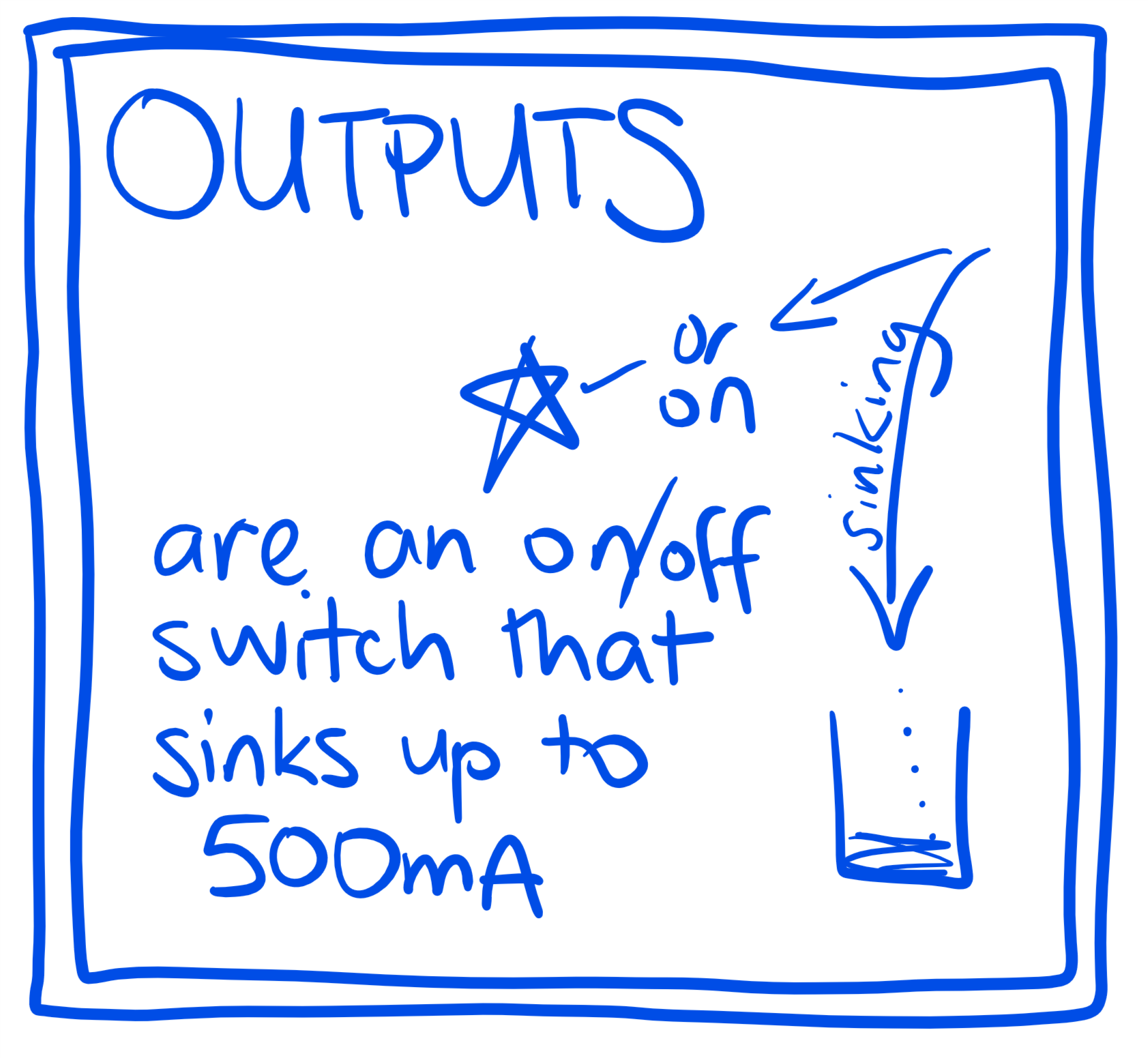 We'll start with outputs. They are essentially on or off because of electricity, which can travel at the speed of light, so it can switch on and off really fast. In fact, you can even use it to do something called Pulse Width Modulation (PWM) which is a fancy name for turning things on and off very fast. You can choose how long it is actually on for in each "pulse".