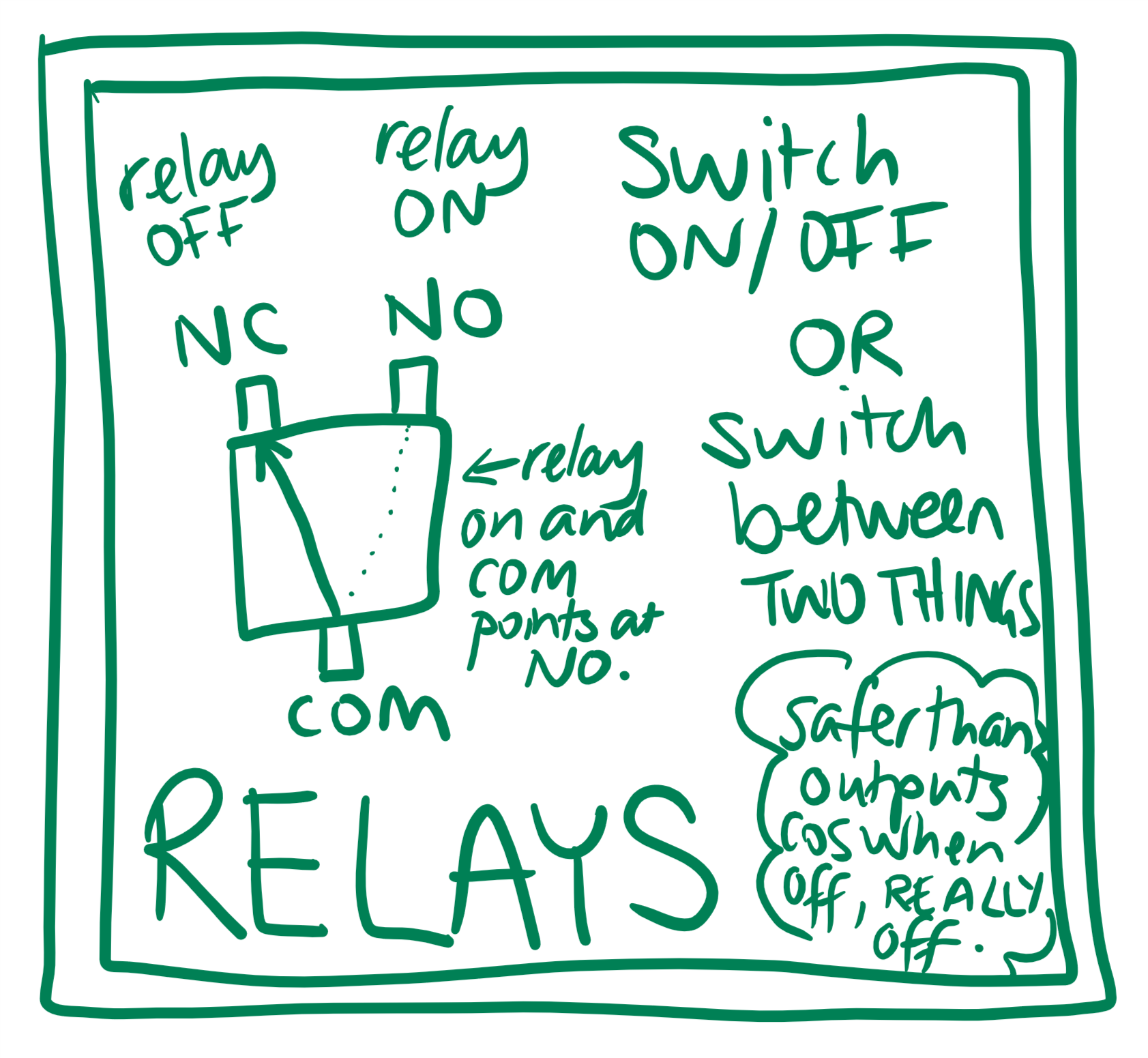 The other, (relay) is a switch that either completes the circuit (and electricity flows) or doesn't complete the circuit (and no voltage gets round). It can cope with 2A of current going through, but after that we get the Too Hot problem again. This time the dinosaur trainers can open and shut gates to hold back up to 24V of angry velociraptors, which is physically what happens inside the relay. Except without the velociraptors. :(