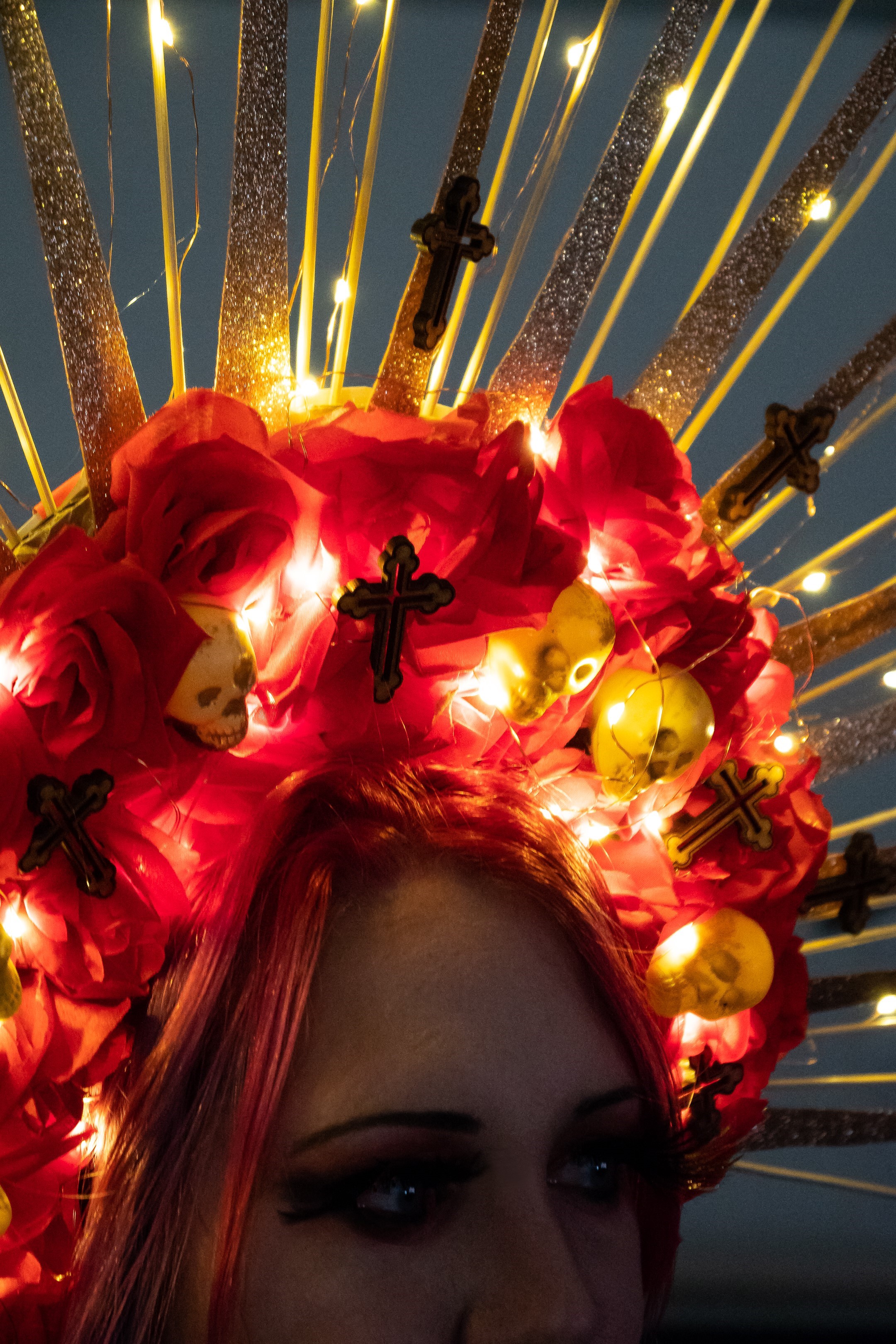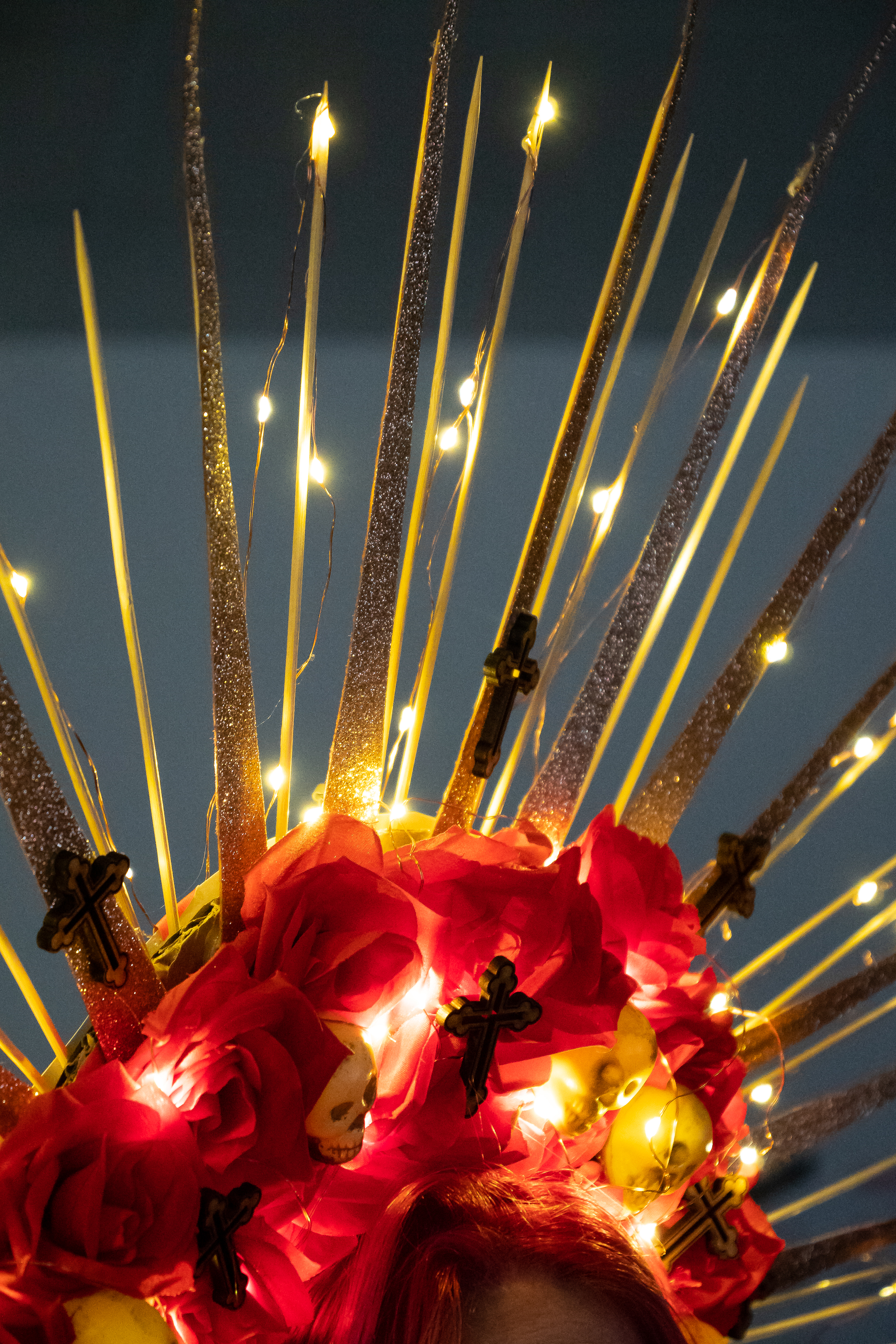 Of course, when you're researching imagery for graphics and whatnot, you come across some real inspiration sometimes. This BBC article had me doing the coo-eyes at a headdress in the very last photo. Skulls! Flowers! (most exciting of all) LEDs!