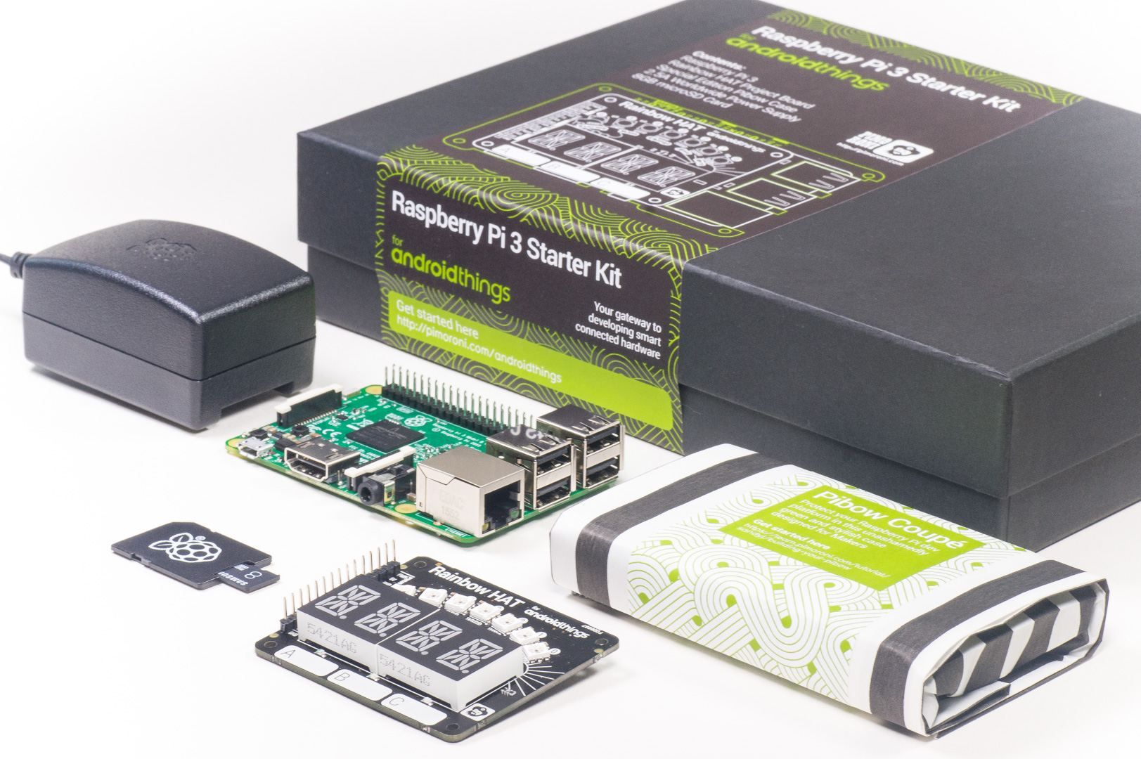 We’ve put together a really neat little starter kit to get you going with Android Things™ on the Raspberry Pi 3. It contains: a Rainbow HAT, a Raspberry Pi 3, a special Android Things™ branded Pibow Coupé in Android green, a worldwide power supply, and an 8GB microSD card with the Raspbian OS on.
