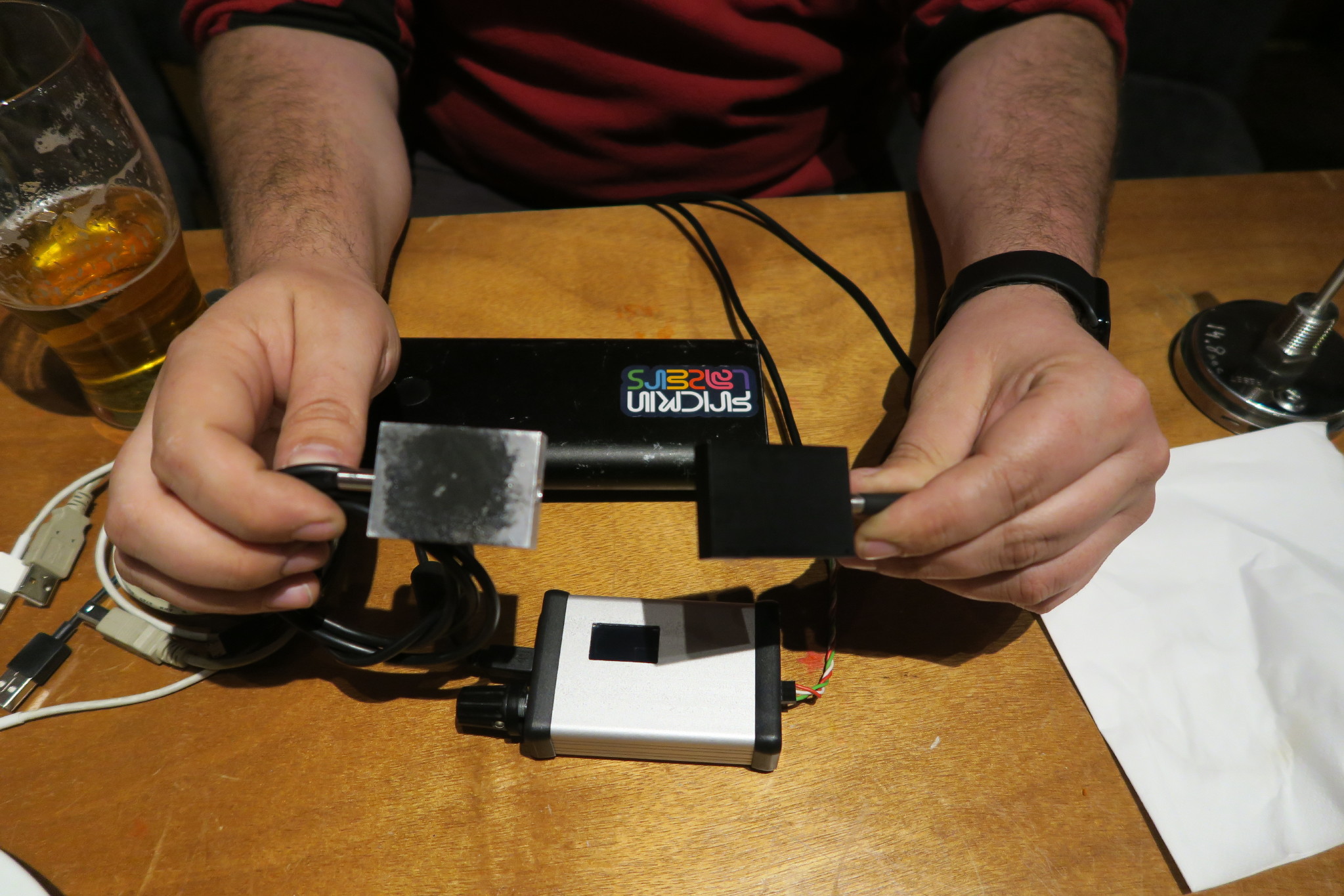 In no particular order, on with the hacks! Rob brought along an innocent looking aluminium block with a display attached by a wire. We had a go at seeing how much wattage we could produce with the warmth of our hands (Tanya 10W, Paul 7W), as this was a device that you point your laser at to measure the approximate wattage of your laser. Rob has just started at Smoke and Mirrors and knows a lot about lasering... :)