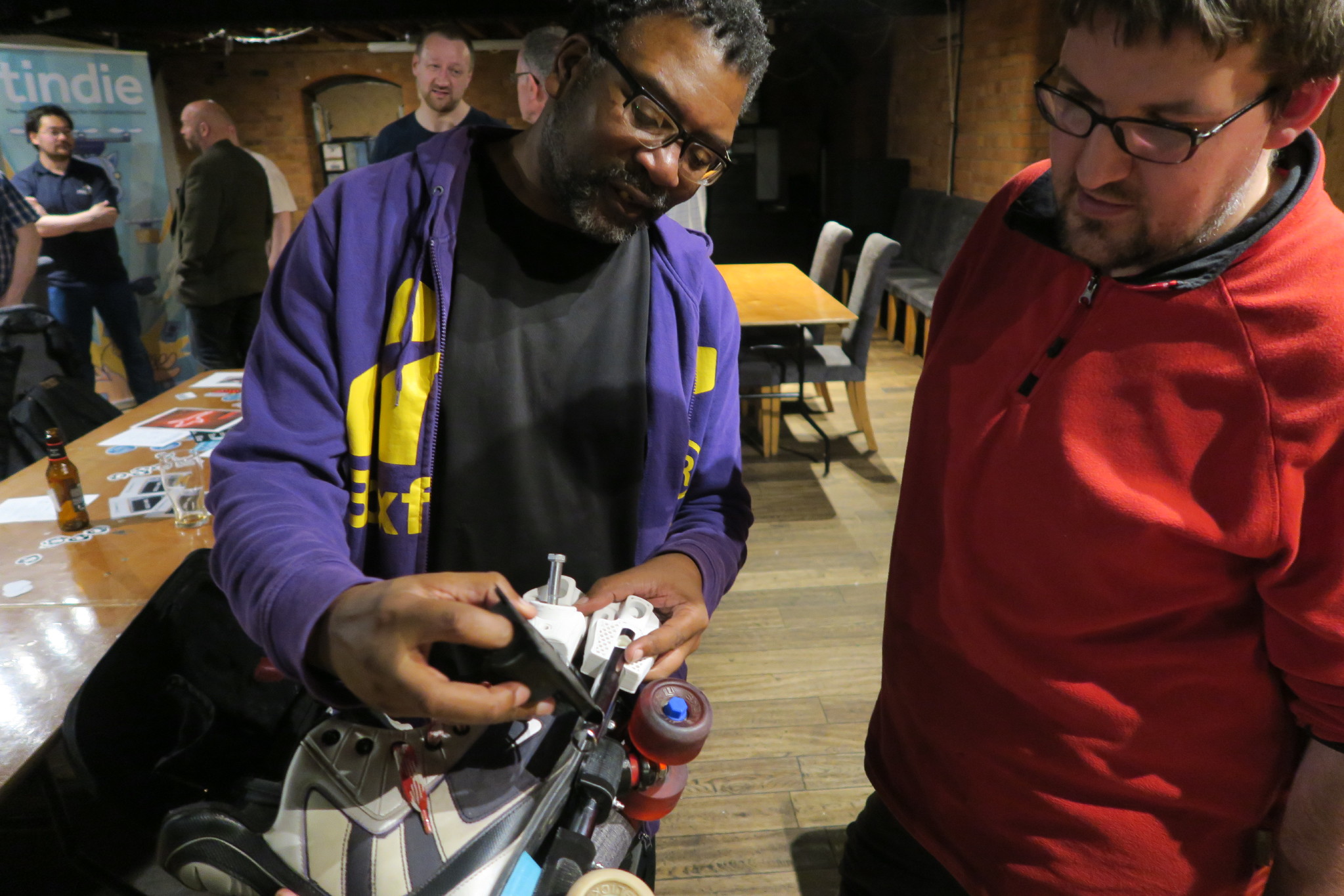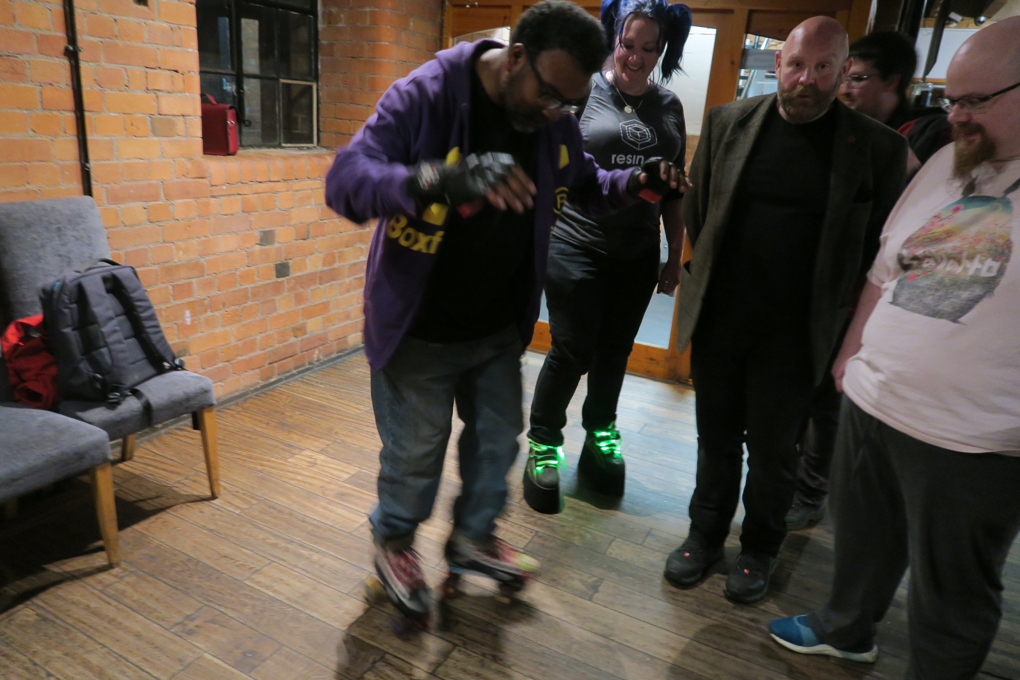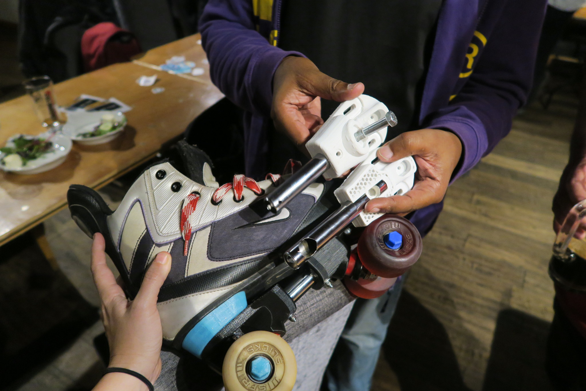 Dave brought along his 3-d printed rollerskates - he printed them with the cheapest materials on the cheapest printer he could find, and has been busy destruct testing them on every available surface and with every style of skating. We saw him jump, dance, rock, twist, and lean at a highly improbable angle and they stayed firm! He showed us how the design has progressed, sticking to his ethos of cheapest materials, readily available, so that these will be a truly accessible skate.