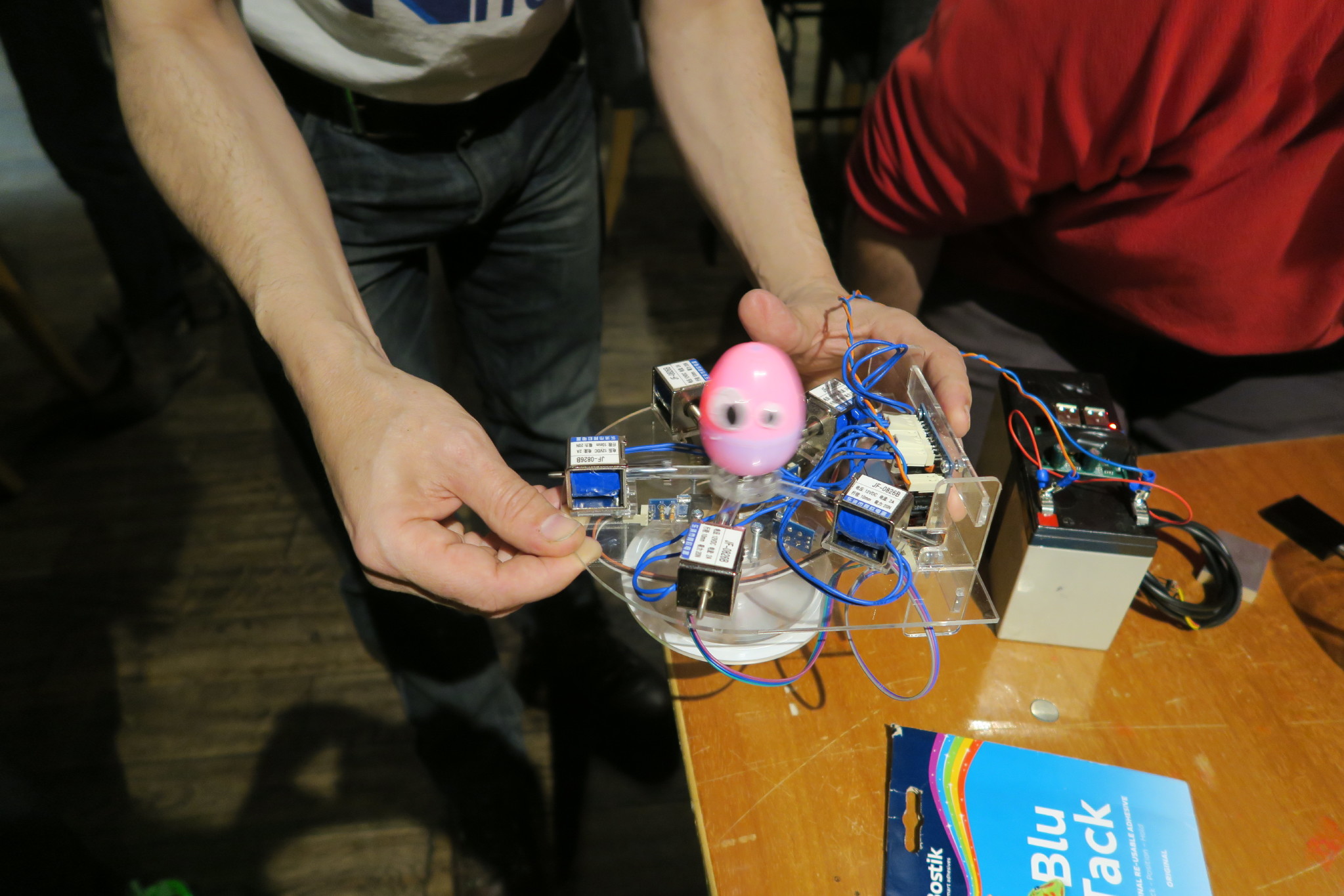 Derek from Extreme Electronics and Extreme Kits (L) brought along some proof that no matter what he's challenged to, he makes it! Dominic Morrow (R) saw his solenoid engine kit, and said it'd be better with FIVE solenoids... so guess what happened? Derek was kind enough to let our Weeble have a ride on it like some crazy merry go round.